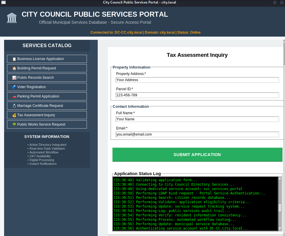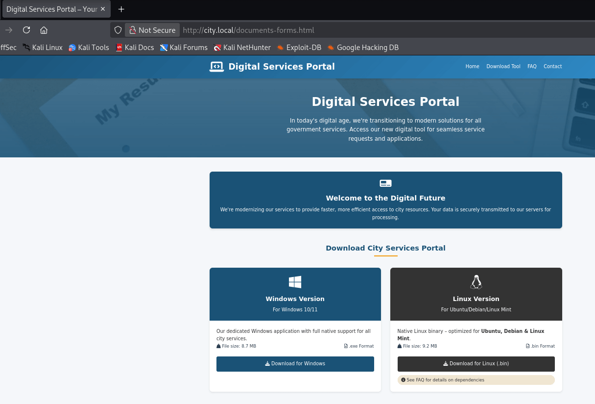 Browsing to port 80 lands on a “Digital Services Portal” - a municipality-branded page offering downloadable applications for Windows and Linux. The pitch is that residents need to install the tool to submit service requests.