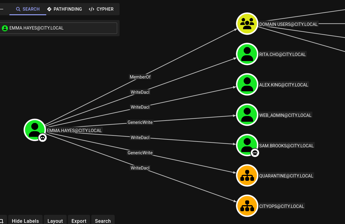 BloodHound shows that emma.hayes has WriteDACL over sam.brooks, rita.cho, alex.king, and web_admin, with WriteDACL over the CityOps OU as well.