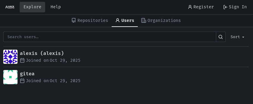 Browsing to https://gitoops.local presents a Gitea instance running version 1.25.0. Without credentials we can still enumerate public content. Two user accounts are visible - alex and gitea - and there is one publicly accessible repository: gitCorp/public.