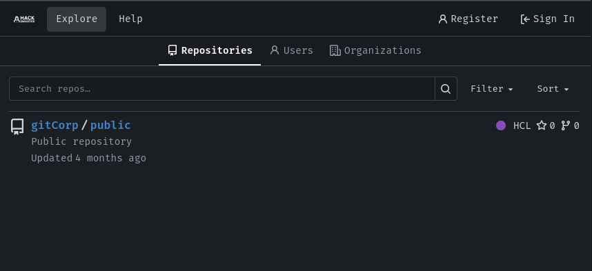 The gitCorp/public repository contains Terraform HCL code and is the first interesting lead. Reviewing the commit history, the most recent commit message reads “Update backend to use S3”, which immediately suggests that the Terraform state backend was migrated from local storage to a remote S3 bucket. Looking at the diff for settings.tf confirms this: