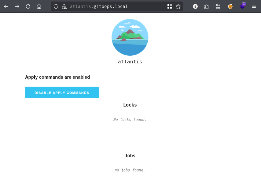 This is Atlantis, a self-hosted GitOps tool that listens for pull request events and automatically runs terraform plan and terraform apply on behalf of developers. Critically, the full command line - including the Gitea API token and webhook secret - is visible to all local users through the process table. We add atlantis.gitoops.local to our /etc/hosts file and confirm the service is running: