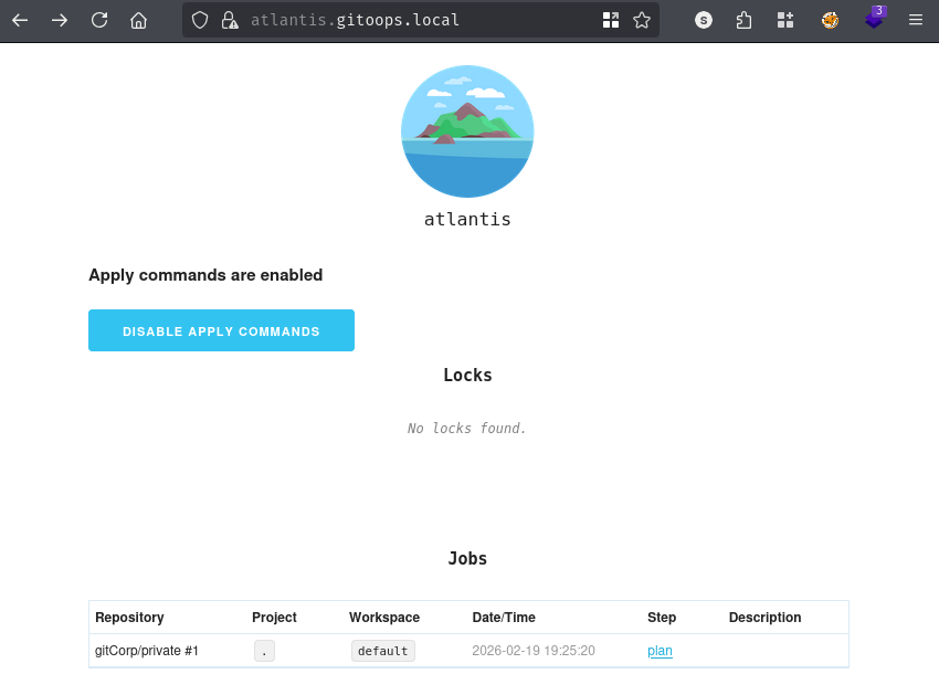 Once the pull request is created, Gitea sends a webhook event to Atlantis notifying it that a new PR has been opened against the monitored repository. However, in the default Atlantis configuration, receiving a PR event does not automatically trigger a plan - autoplan must be explicitly enabled in repo.yaml for that behaviour. Since the Atlantis process here is running with its configuration at /opt/atlantis/repo.yaml and no autoplan jobs fired immediately after PR creation, we can infer it is disabled. This is actually the more common and conservative deployment pattern in production environments. To trigger execution, we post an atlantis plan comment to the pull request, which is the standard way to manually invoke a plan regardless of whether autoplan is configured: