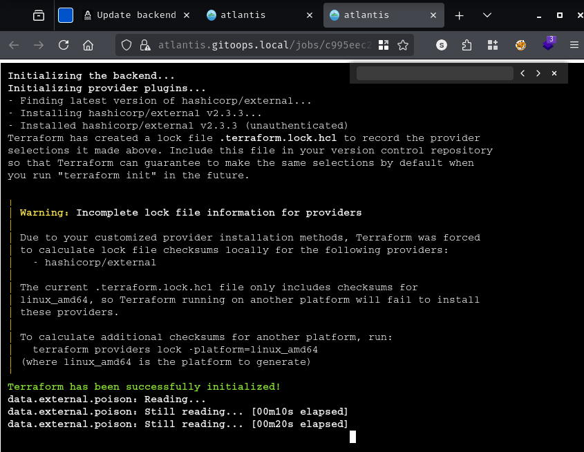 Atlantis picks up the comment trigger, clones the repository at the PR branch’s HEAD, and begins executing terraform init followed by terraform plan against our injected main.tf.