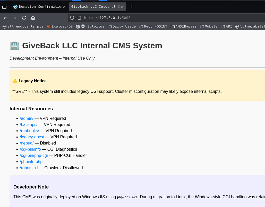 root in the Legacy Intranet ContainerNavigating to http://localhost:5000 presents what appears to be a legacy internal CMS. The page notes that the application was originally built on Windows IIS and later migrated to Linux while retaining its CGI-style PHP handling. Crucially, it exposes /cgi-bin/php-cgi directly.