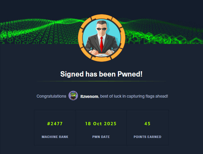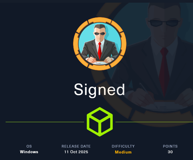 Signed is an assumed breach Windows Active Directory machine that demonstrates several sophisticated attack vectors. Initial enumeration reveals SQL Server credentials that lead to authenticated access. From there, the path to SYSTEM involves forging a Kerberos silver ticket to gain sysadmin privileges on the SQL Server, establishing a reverse shell, and ultimately leveraging NTLM reflection attacks through internal pivoting to relay authentication and gain SYSTEM access via WinRM.