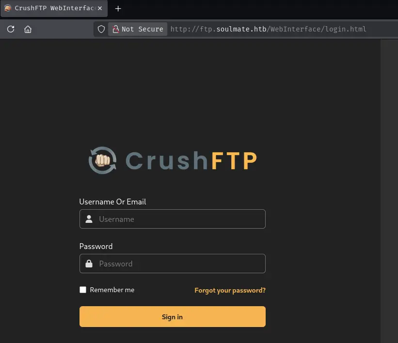 I add this to /etc/hosts and navigate to http://ftp.soulmate.htb, which presents a CrushFTP Web Interface login page.