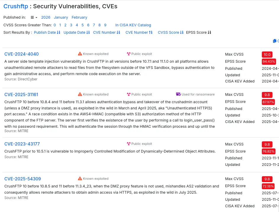 Without an obvious way to fingerprint the exact CrushFTP version from the login page, I search CVE databases for recent CrushFTP vulnerabilities with high severity scores. On cvedetails.com, two CVEs stand out with high EPSS (Exploit Prediction Scoring System) scores: