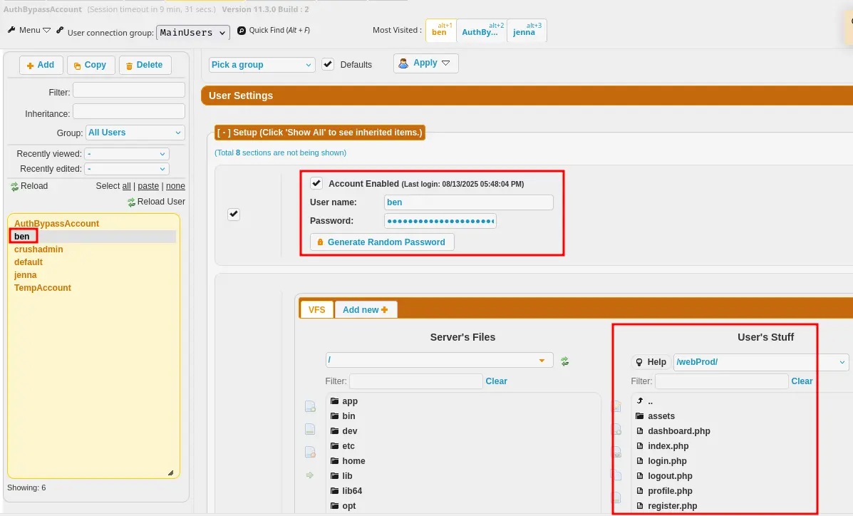 In the Users Management tab, I discover two users: Ben and Jenna. Examining Ben’s configuration, I notice he has a directory at /webProd/ containing PHP files. This directory is served by the main web server at soulmate.htb, presenting an opportunity for code execution if I can write to it.