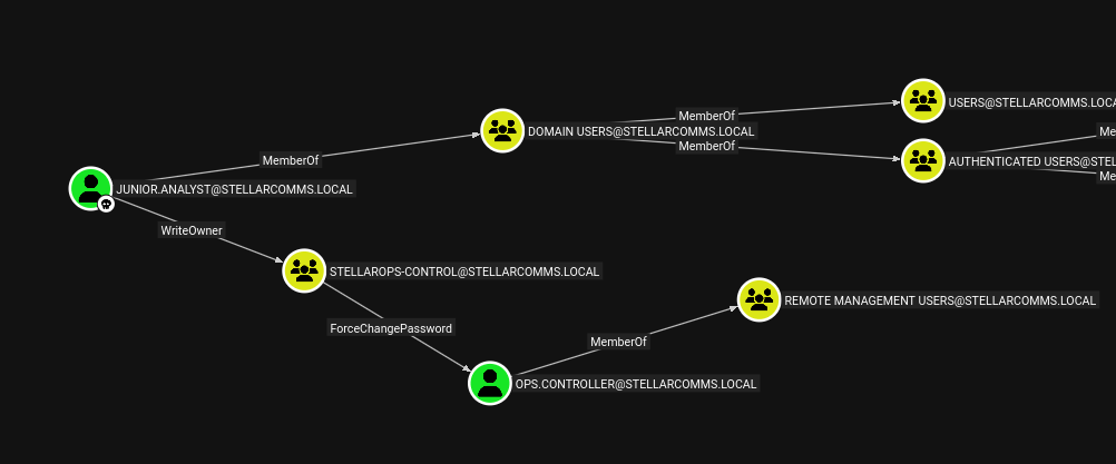 junior.analyst has WriteOwner on the STELLAROPS-CONTROL groupSTELLAROPS-CONTROL has ForceChangePassword over ops.controllerops.controller is a member of Remote Management UsersFirst, I’ll set myself as the owner of the STELLAROPS-CONTROL group: