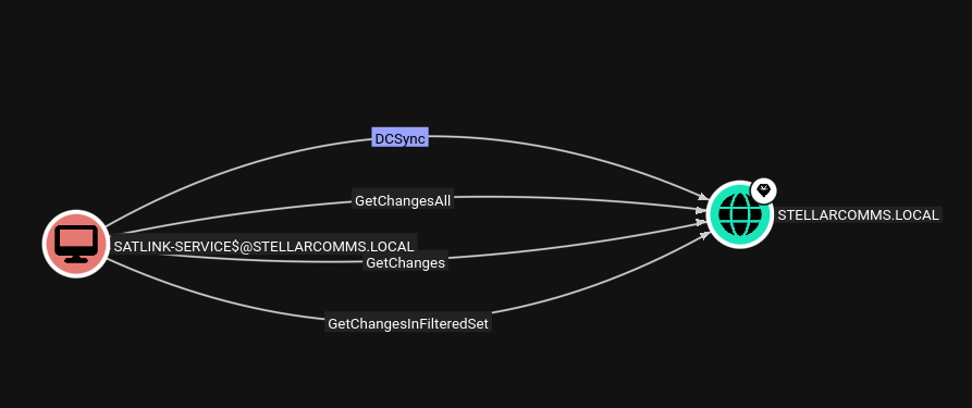 Checking BloodHound again, SATLINK-SERVICE$ has DCSync rights over the domain. I’ll use this to dump the Administrator hash:
